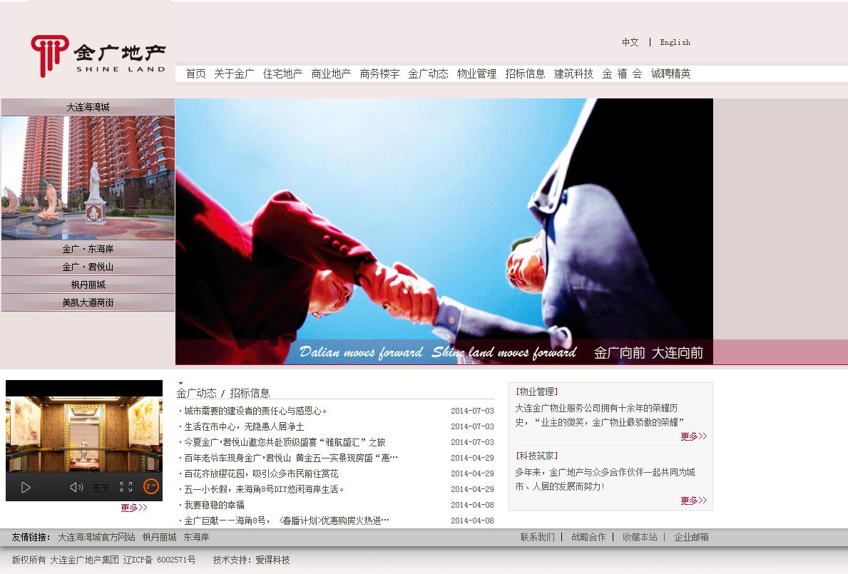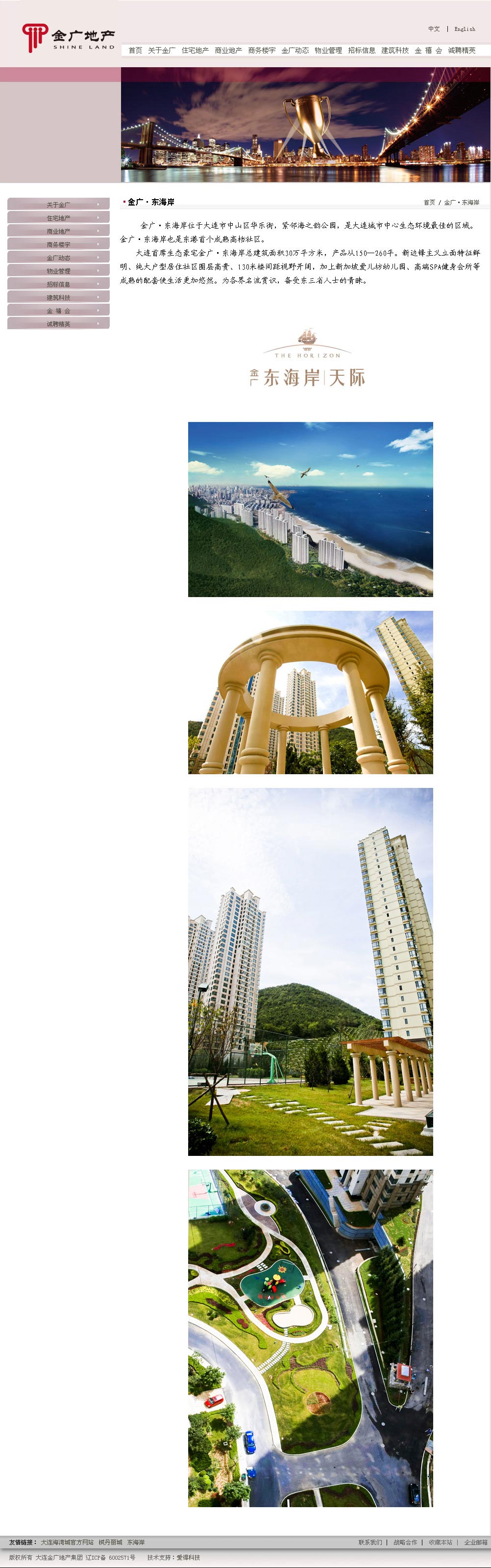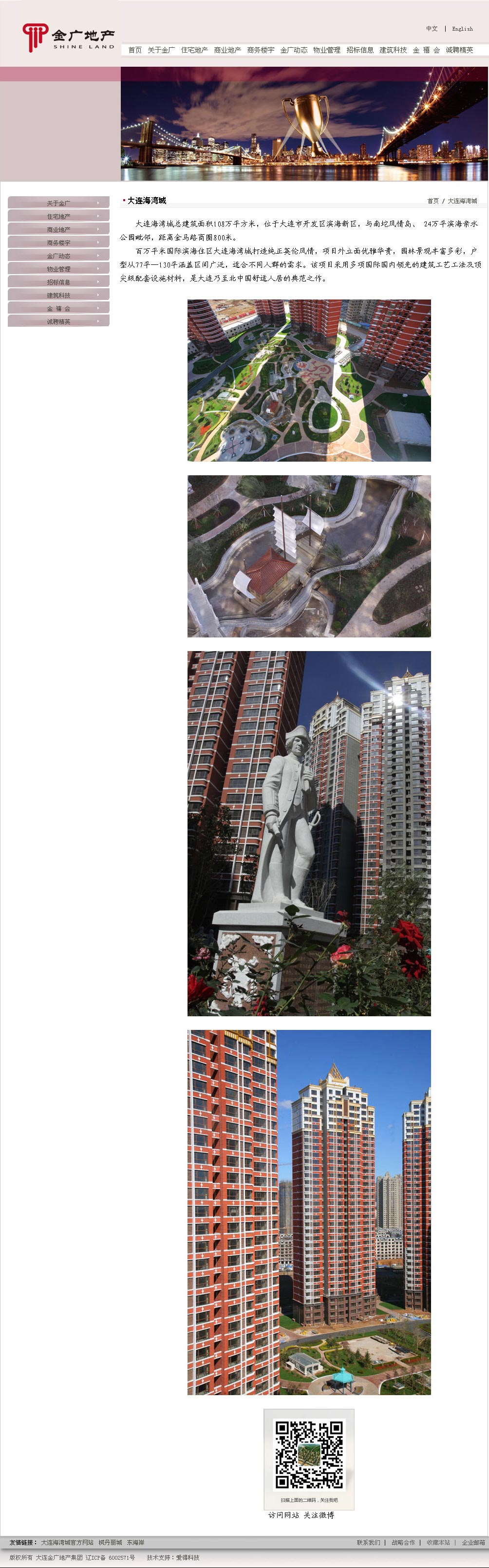 ? ? ? 大連金廣地產(chǎn)集團(tuán)有限公司是大連知名品牌企業(yè),是大連第一批進(jìn)入房地產(chǎn)開發(fā)領(lǐng)域的企業(yè)之一,至今已有18年歷史。十多年的持續(xù)發(fā)展,成為大連房地產(chǎn)界最具綜合實(shí)力的支柱型企業(yè)之一,為社會(huì)的居住文化和人文環(huán)境奉獻(xiàn)了綿薄之力,為城市和歷史留下優(yōu)秀的建筑作品。