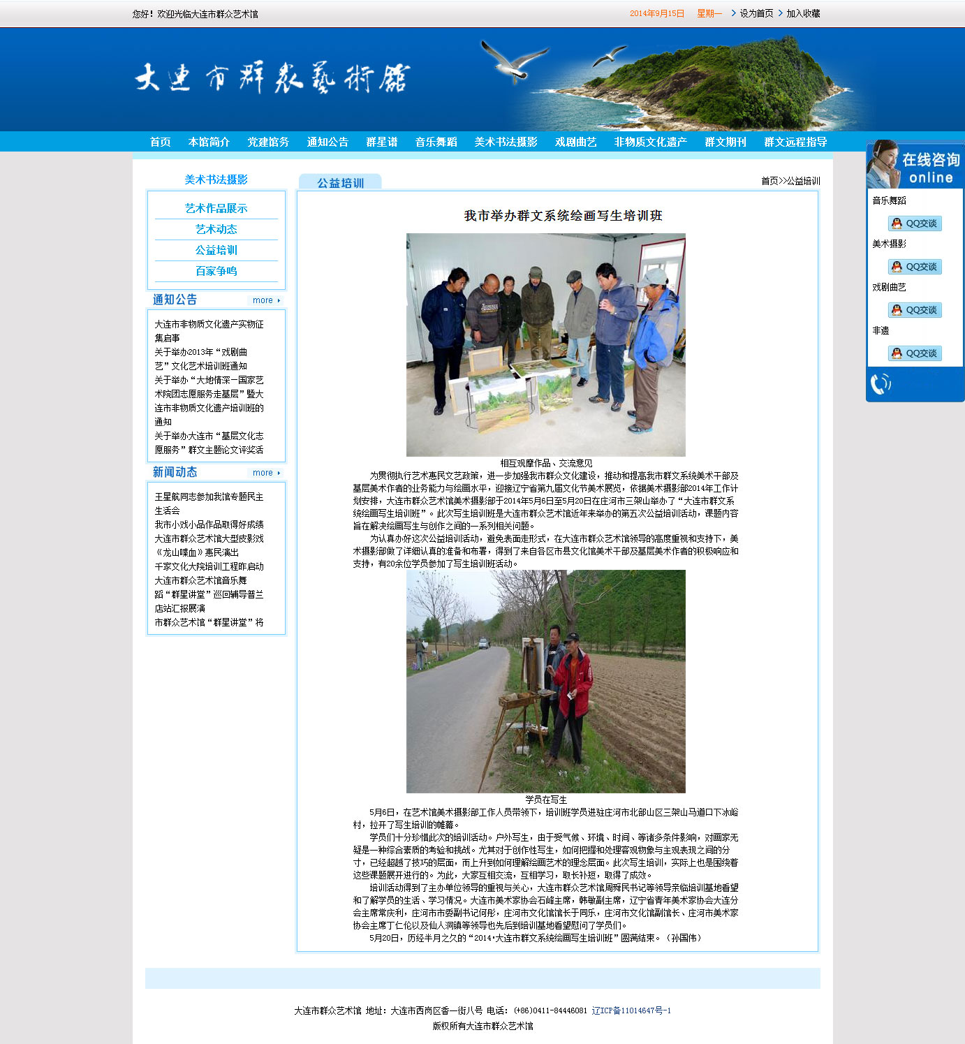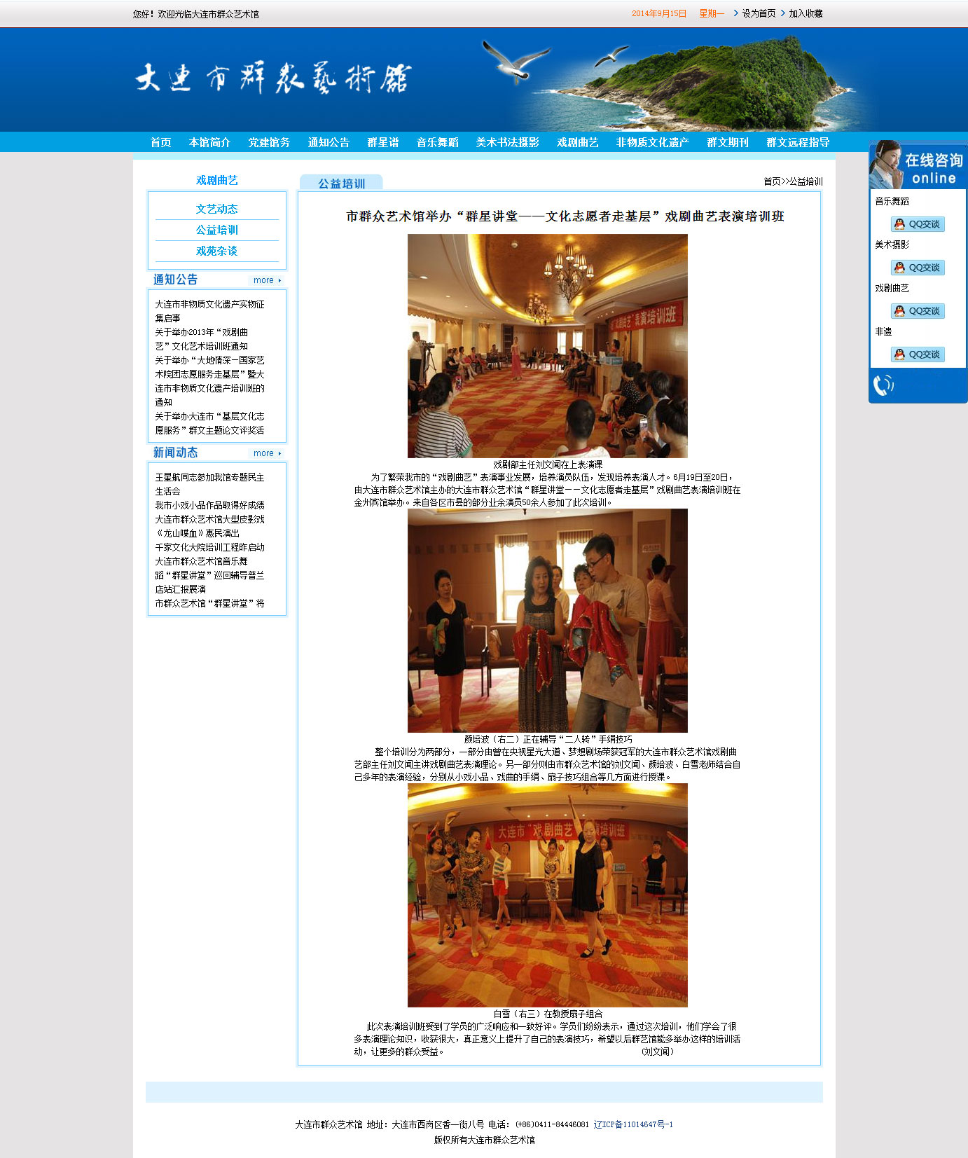 大連市群眾藝術(shù)館建于1956年,是隸屬于大連市文化廣播影視局的正處級(jí)全額撥款事業(yè)單位,國(guó)家一級(jí)文化館。2006年,被市編辦批準(zhǔn)加掛大連市非物質(zhì)文化遺產(chǎn)保護(hù)中心牌子。